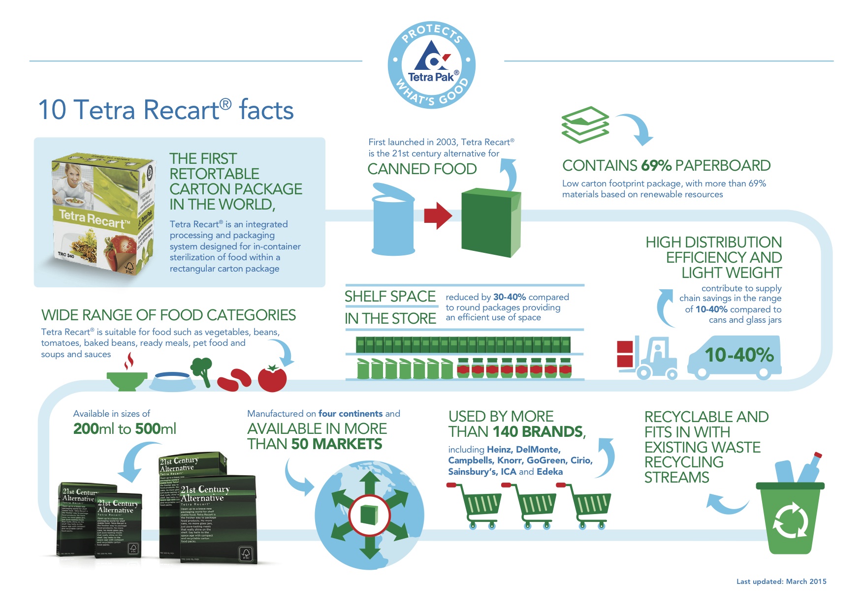 Today, more than 140 brands in over 50 markets around the world are using Tetra Recart. Tetra Pak says they are choosing the carton as an environmentally friendly, strong, easy to stack and eye catching alternative to meet consumer demands for safety, convenience and environmental performance in the 21st century. So, what exactly are the benefits?