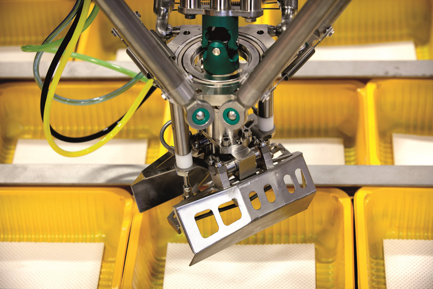 The RobotGrader is weighing products on a belt weigher. The information is then fed into the system’s sorting algorithms that determine the robot’s selection of the pieces. The robot stores the information on a large number of weighed pieces and the system also optimises the number of trays within the reach of each robot, maximising availability from which to create each complete pack. The robot gripper has been designed to grasp each piece firmly but gently and to orientate it correctly in the trays; for example, placing two chicken drumsticks in opposite directions.
