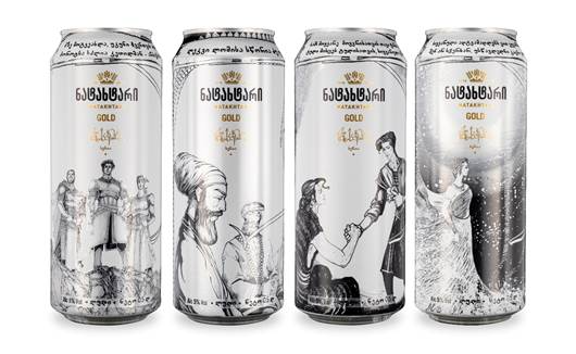 The series, for Georgia’s beer brand Natakhtar, contains four elaborately decorated cans that depict a poem’s main characters and its key themes – wisdom, friendship, love and gender equality.